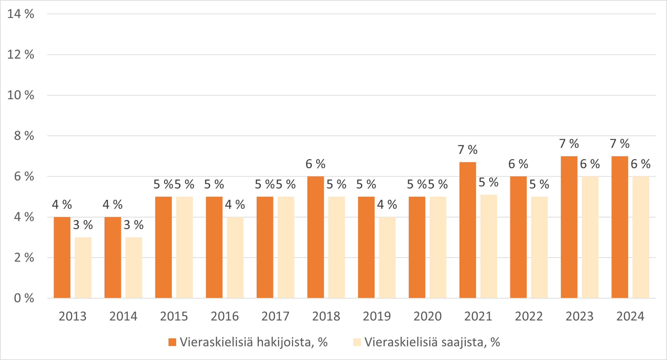 Kun Taiteen edistämiskeskus (Taike) perustettiin vuonna 2013, vieraskielisten osuus apurahojen hakijoista oli 4 prosenttia (kuvio 1). Tieto koskee hakijoina olleita luonnollisia henkilöitä (yksityishenkilöitä). Vuoteen 2024 mennessä osuus oli noussut 7 prosenttiin. Ruotsinkielisiä hakijoita vuonna 2024 oli 5 prosenttia. Apurahansaajista vieraskielisten osuus oli reilut 6 prosenttia ja ruotsinkielisten 4 prosenttia. Yleisimmät hakijan ilmoittamat vieraat kielet vuonna 2024 olivat englanti, espanja ja venäjä, kuten edeltävinäkin vuosina. (Taike, 2025.)