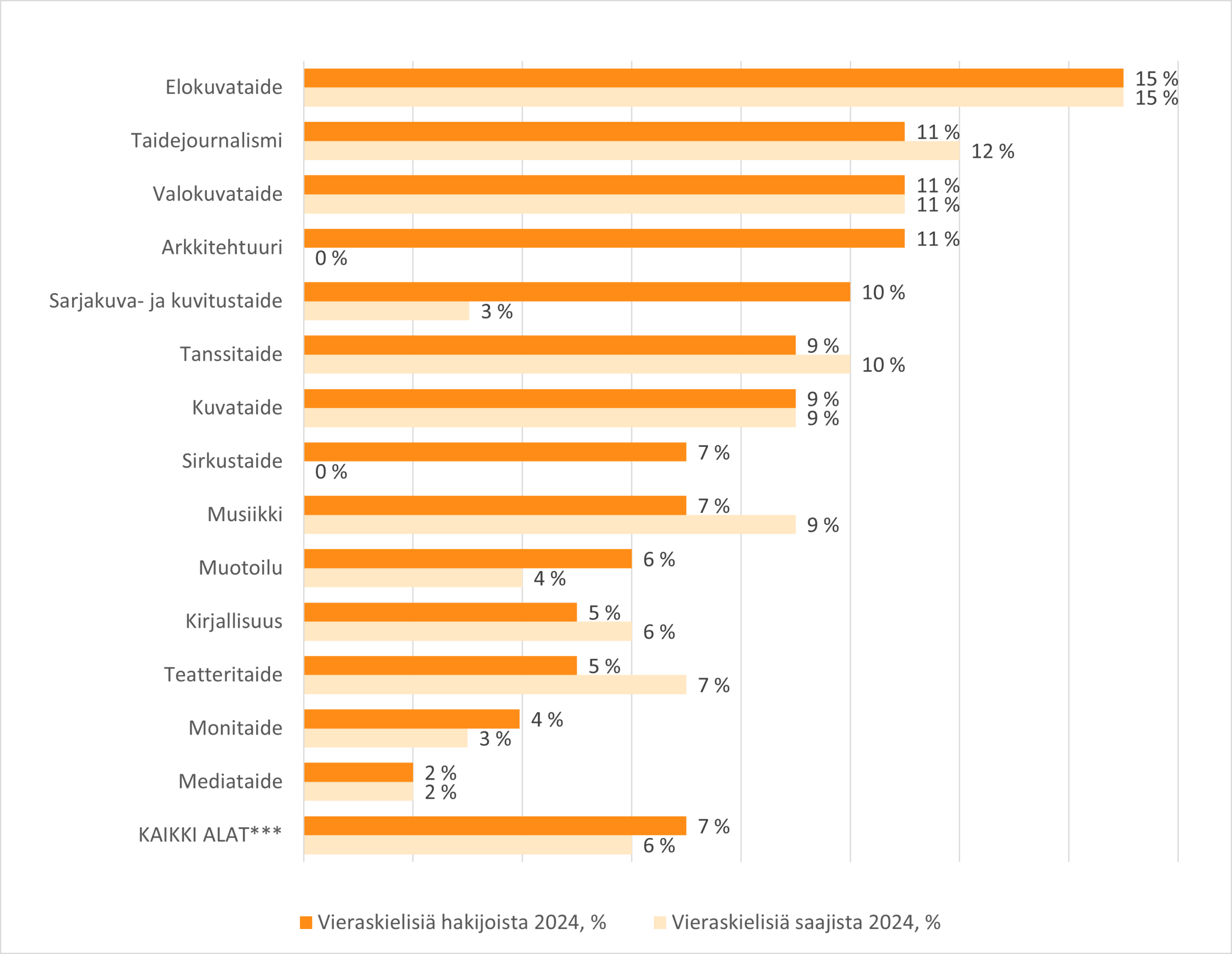Vuonna 2024 vieraskielisten hakijoiden osuudet olivat suurimmat monitaiteessa1 (15 %) ja arkkitehtuurissa (11,5 %), vieraskielisten saajien osuudet taas monitaiteessa (15 %) ja valokuvataiteessa (12 %) (kuvio 2). Kaikista hakijoista vieraskielisten osuus oli 7 prosenttia ja saajista 6 prosenttia. Lukumääräisesti vieraskielisiä hakijoita vuonna 2024 oli eniten kuvataiteessa (158), musiikissa (97) ja monitaiteessa (63). Vieraskielisiä apurahan saajia oli lukumääräisesti eniten kuvataiteessa (29), musiikissa (11) ja valokuvataiteessa (8). (Taike, 2025.)